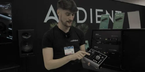 Förutom ljudkortet EVO 16 och mickförstärkaren SP8 visade Audient upp det nya lilla ljudkortet iD24. Chris Philips från Audient demonsterar.