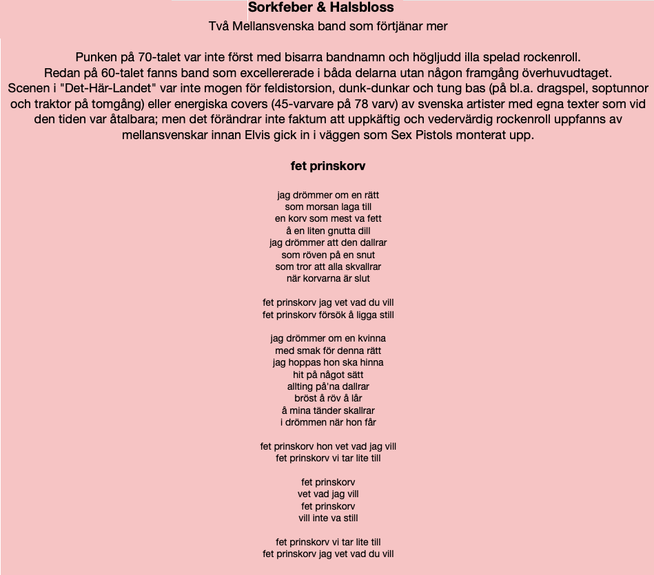 Pär Nord Postat 1 timme sedan Postat 1 timme sedan Legenden om den Mellansvenska protopunken brinner. Med mkt flämtande låga alltså. Låten "Fet Prinskorv" (text bifogad nedan) med SORKFEBERS omisskänsliga "traktor- manglar-hembrända-soptunnor-på-postordergitarrer" har jag ännu inte hittat bland reabackarna med rullband och kassetter längs f.d., s.k. riksvägar. Det obskyra utländska bandet "LEMMYNG & THE VOLES" gjorde en version med FEL TEXT som låter som vilken feg och fantasilös "rock and roll" som helst. Kanske hittar jag låten i en gödsel-stack nånstans i Mellansverige - jag fick ett tips... SORKFEBERS Fet Prinskorv (cover på engelska %22Fat Princess%22 med %22Lemmyng & The Voles%22 .mp3