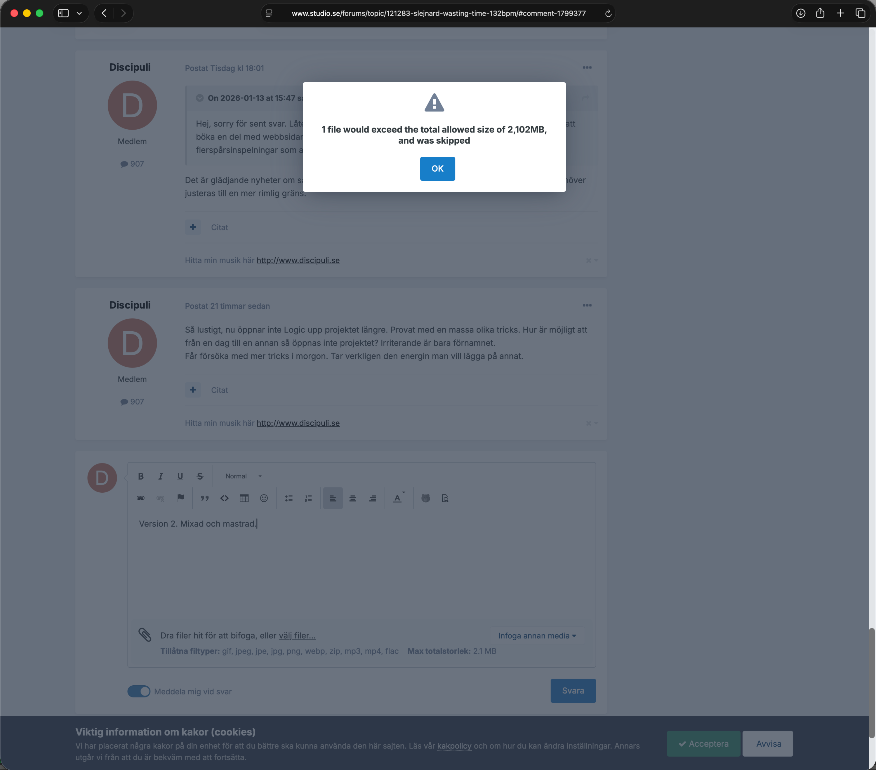 Discipuli Postat 15 januari Postat 15 januari Version 2. Mixad och mastrad. On 2026-01-13 at 18:01 sa Discipuli: Det är glädjande nyheter om så är fallet. Om inte det är en glitch, så känns det som att gränsen behöver justeras till en mer rimlig gräns. @Henrik Andersson Vogel Se bilagan, Jag kan inte lägga upp under 9 MB. Fler som har samma problem ?