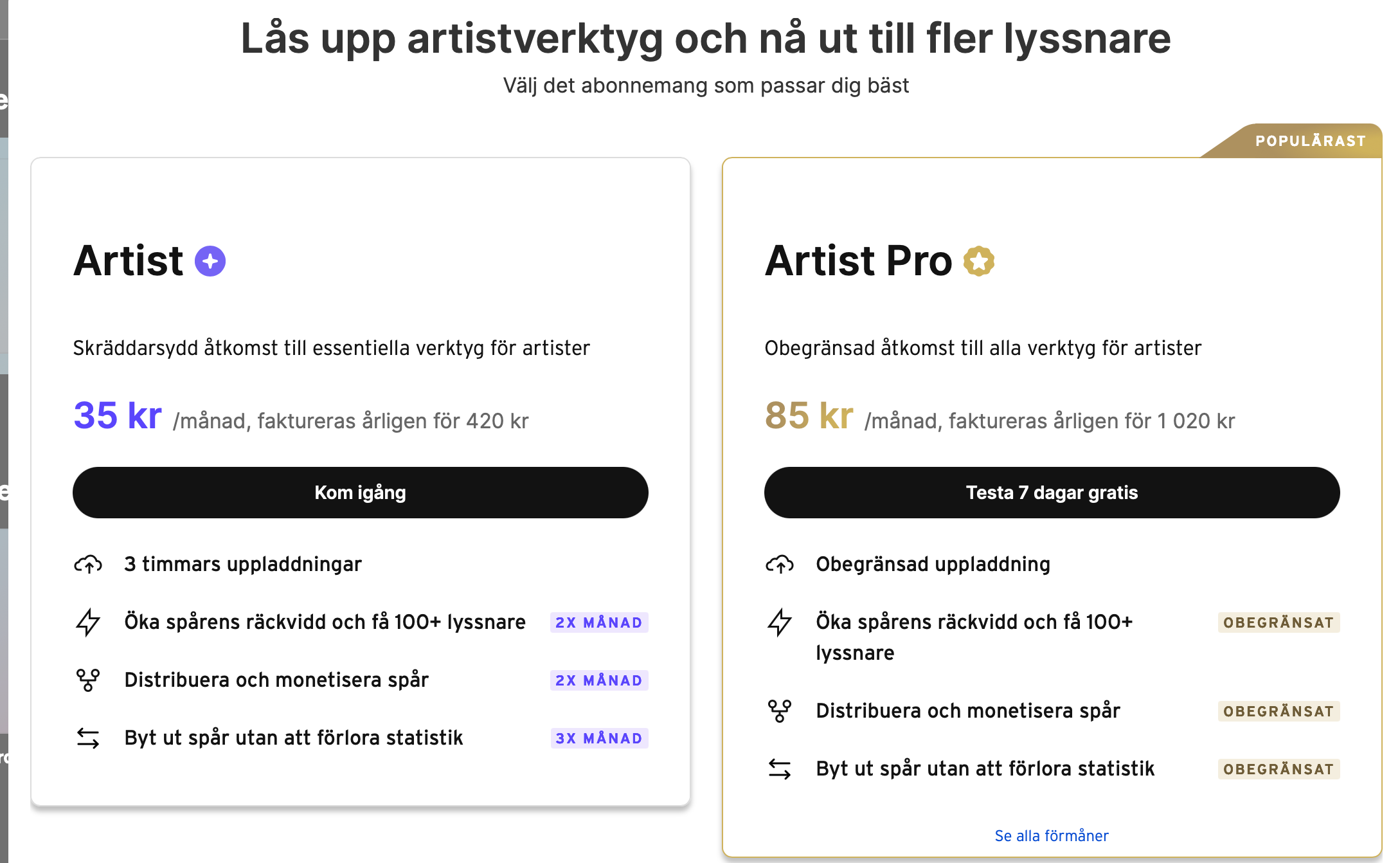 Discipuli Postat 1 timme sedan Postat 1 timme sedan Hallo tjena hallooj! Jag funderar på om det är värt att skaffa soundcloud artist pro och få allt som det medför inklusive distribution , Göra en satsning i år runt det. Det är ca 1000kr/år Har någon här erfarenhet av att ha Artist pro? https://checkout.soundcloud.com/artist?ref=t061 Eller Landr Med deras just nu rabatterade Distribution Pro för 462 kr/år . Ordinarie 924kr, så ca 1000 kr för dem också på sikt.. https://www.landr.com/pricing/release?utm_source=bing&utm_medium=paid_search&utm_campaign=sales_platform_en_intl_landr&utm_term=landr&utm_content=