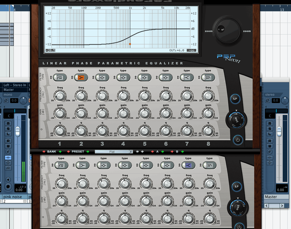 Jag kör samma typ av test på ytterligare en eq-plugg. PSP Neon den här gången. En faslinjär EQ, även den med "analog-modeled [...] filters". Efter att ha matat in värdena i båda instanser släcks signalen ut helt.