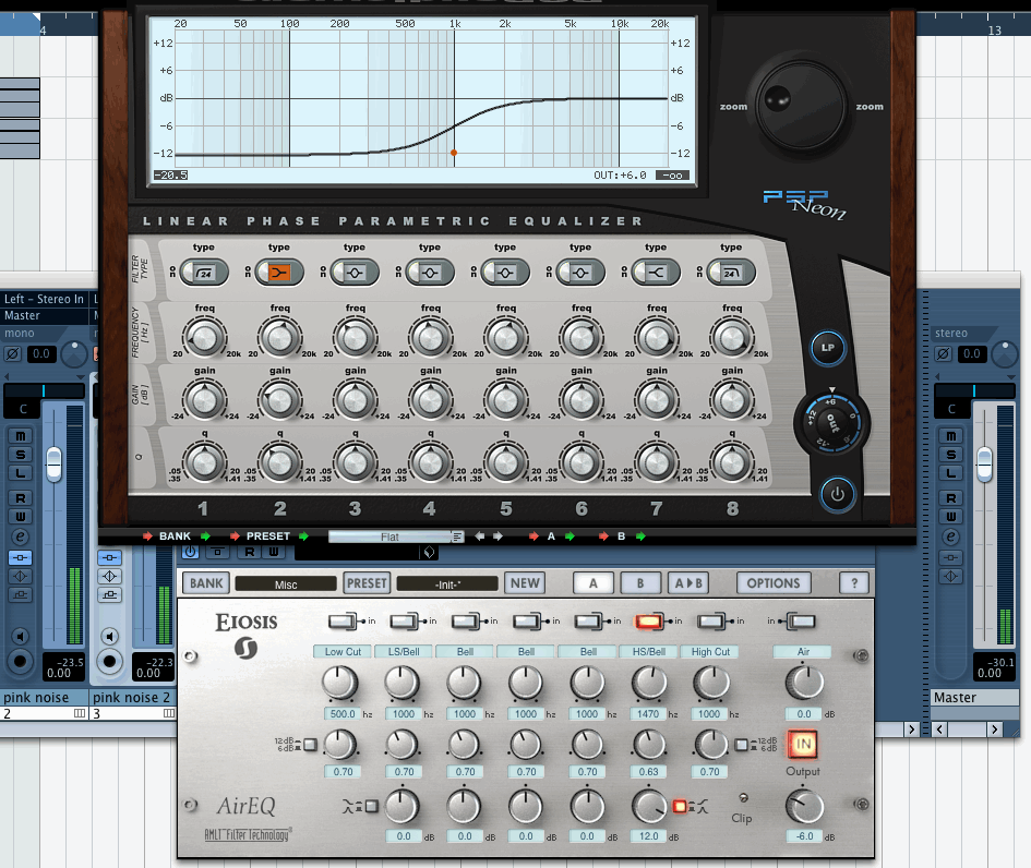 Testar också att släcka ut PSP Neons low shelving med ett high shelving från Eiosis AirEQ. Justerar q-värden, gain, centrumfrekvens och utgångsvolym. Det går sådär. Jag lyckas som mest släcka ut ungefär sju, åtta decibel. Och då är den ena eq'ns centrumfrekens är uppe på drygt 1400 hertz.