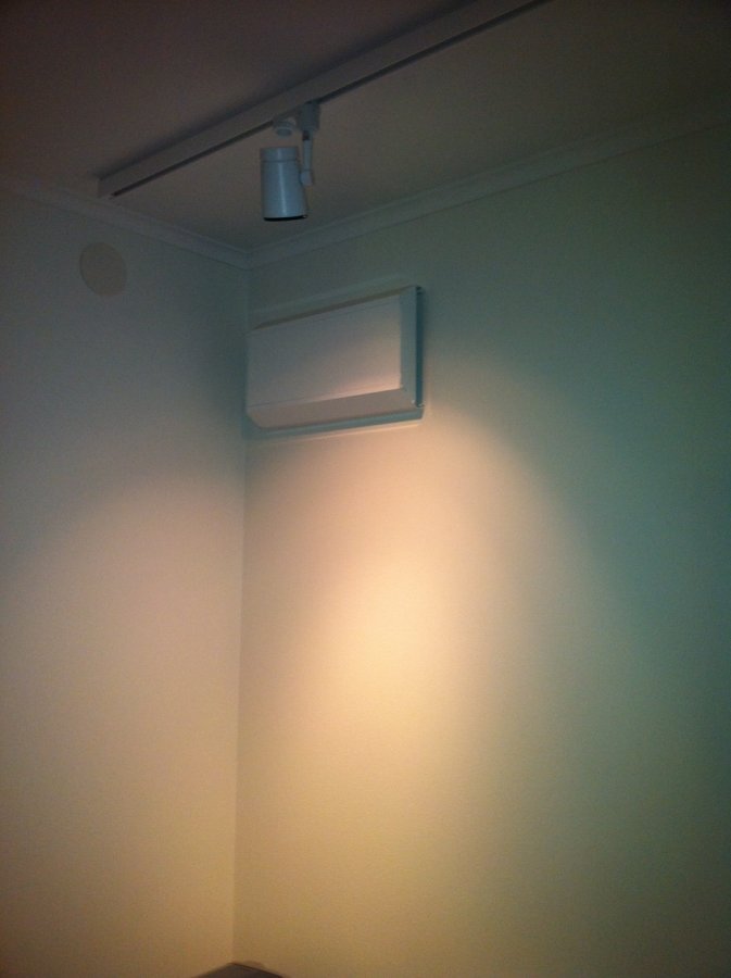 wellness music Postat 23 september 2012 Trådstartare Postat 23 september 2012 Så här blev det med tilluften till kontrollrummet (2 st). En kanal kommer utifrån och den andra är en överluft från kontor / blivande pentry. För en gång skull gjorde jag en enkel lösning och hängde upp lådan på konsoller som låses med 2 stoppskruvar från ovansidan. Bild från intillliggande fikarum där jag använt ett ljuddämpat överluftsdon jag hade liggandes. På andra sidan gipslåda.