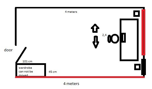 23. Denna bild gjorde jag sista vevan jag försökte få ordning på skiten. Det tjocka röda är ett fönster och det jämte det är en balkongdörr. rummet är 4m djupt, 2,40 brett och 2,40 högt. Har förskt spela in i hörn också. Låter fan ukelele i en toa.
