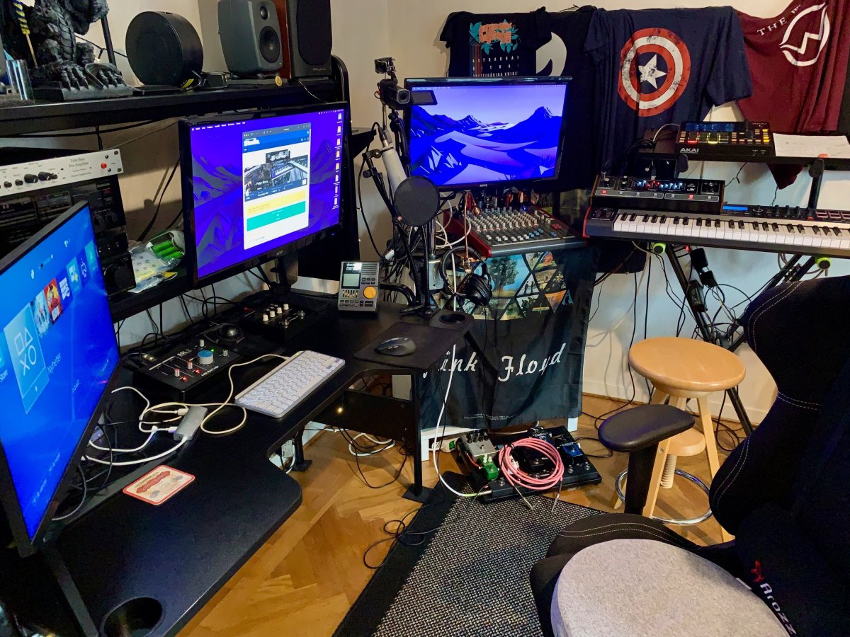 Jag har hemstudion i ett hörn av vardagsrummet (där jag just nu sitter och plockar med bas- och keyboard-arret i en låt i Camel-coverbandet Moonmadness). Bra ergonomi är viktigt, tycker jag. Kör med Arozzi gaming-stol vid mix/redigering och annat, och en gammal Ikea-pall när jag lirar bas/keys.