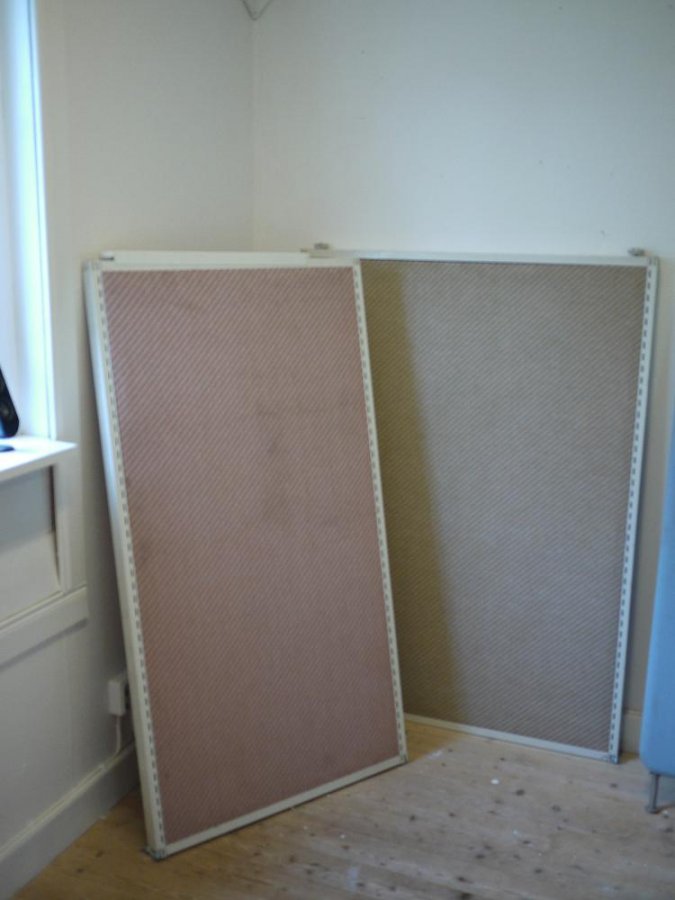 1. Hej alla mednördar! Jag är helt ny med det forum så säg till ifall jag gör något helt "galet" Jag håller på att bygga en studio helt DIY i mitt gamla rum på 15kvm. för att förbättra akustiken (mycket efterklang)så jag har införskaffat gammla kontorsskärmar som jag tänkte smälla upp på väggarna.det jag undrar är ifall någon annan har användit sådana och ifall det är något att ha? bifogar bild ramen är i järn och resten är något halvporöst material med tyg över. tack för svar. //The Wizard