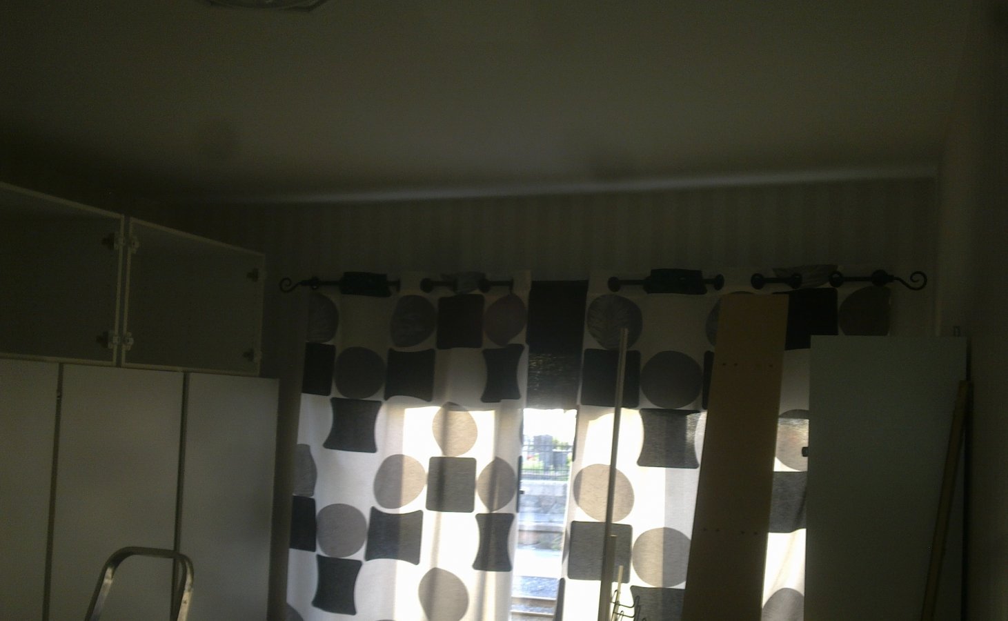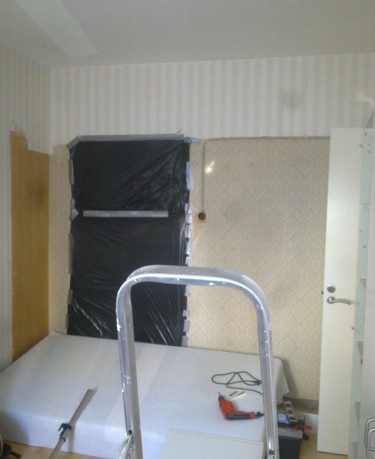 som ni ser på den "mörka" bilden. Där garderoberna står är den väggen utmed mitt vardagsrum. precis här tänker jag att jag ska ha mina monitorer den andra liggande bilden visar den kortsidan mot grannen och vänster långsida mot grannen. där det är plast tejpat har jag hittat den 40cm djupa roxullen innan en betongvägg. sängen står lite snyggt på kanten också som visar dess bredd och djup 🥰 -