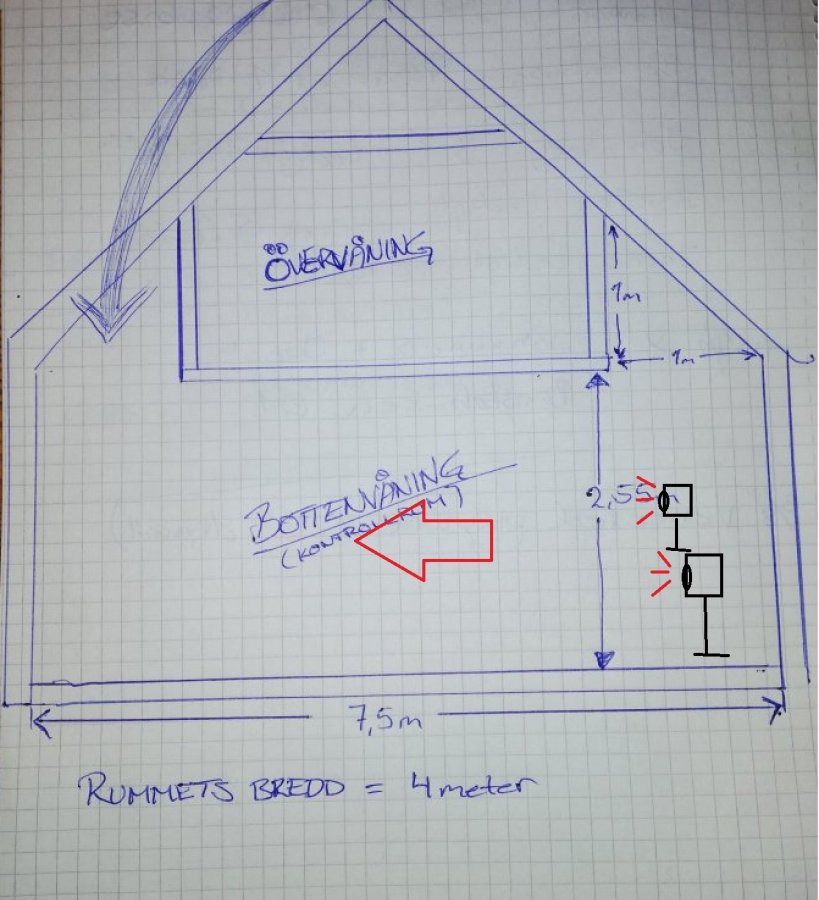 Jag tolkade nog bilden fel, bredd och längd blev jag förvirrad av. Visst är det nått sånthär du hade tänkt dig, men högtalarna på vänster/höger sida av ritningen? Då är det en väldigt bra idé att sätta massa porös absorbent där (stenull) Du får endå göra lika mycket basic behandling som jag berättade innan, men ovanför högtalarna kommer det göra bra skillnad antagligen! Om du har en bakvägg som jag har kommer baksida luftrum inte addera nån stor skillnad för det som studsar där inne har bara akustikväggen att studsa ner i och därmed varken göra till eller från.