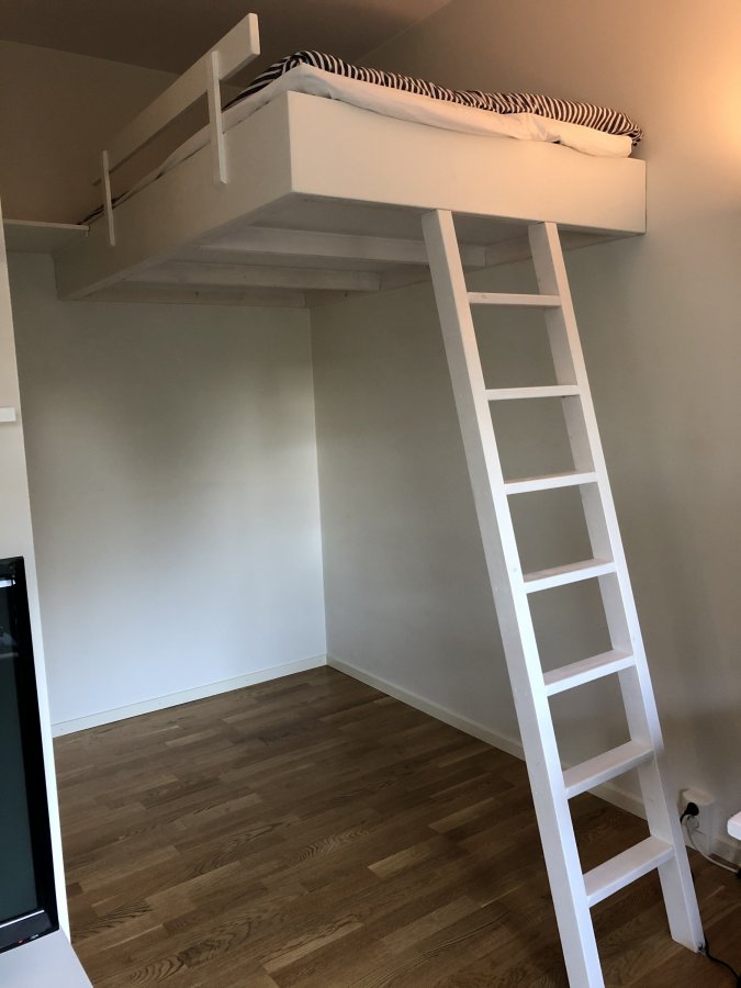 Utrymmet är under ett sovloft byggt i trä och mdf-skiva, i övrigt trägolv, betongväggar och två garderobsdörrar.