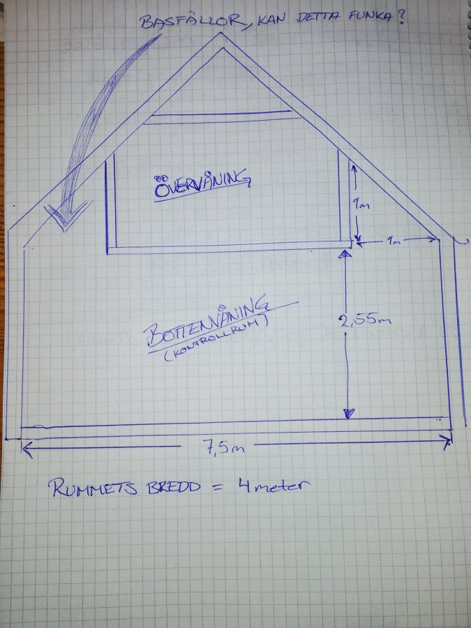 Hej 😊 Självklart, här kommer en skiss. Måtten på basfällan, 1x1x4 meter är minsta måttet. Detta går att stretcha om det behövs. (Det blir bara en mindre övervåning isf, men berätta inte det för min fru 😂)