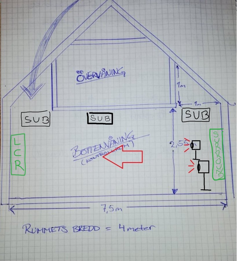 Hej alla, jag har precis registrerat mig på studio.se och detta är mitt första inlägg. Vi håller på att renovera vårt boningshus i etapper och nu har vi kommit till storarummet, jag vill passa på att akustikbehandla storarummet mer seriöst. Detta kommer mestadels användas i vardagligt syfte så som film och stereo lyssning men det kommer även användas som kontrollrum med reaper som DAW och Dynaudio BM15A som studiomonitorer. Rummet som skall behandlas är på bottenvåningen av ett 1,5 plans hus. Golvet är av trä och där under är torpargrunden som är knappt 1 meter i höjd. Här har vi möjlighet för kabeldragning och isolering samt att ev. bygga "resonansdöda" golvytor om så önskas. Rummet är i nuläget 4,0x7,5x2,55 meter och är oisolerat. Rummet som ligger ovanför är endast 5 meter långt eftersom att snedtaket tar upp resterande yta. Nu till en av alla mina funderingar i detta projekt. Går det att använda sig av utrymmet som snedtaket tar upp till att bygga basfällor? I detta fallet så hade det ju inneburit att takhöjden på rummet ökar med ytterligare 1 meter, bredden på dessa basfällor blir då hela rummets bredd, alltså 4 meter. Är ni intresserade av att hjälpa mig igenom detta projekt så skriv bara, vill ni ha bilder eller har ni olika funderingar eller förslag hojta till bara. Ha en underbar helg 🙂