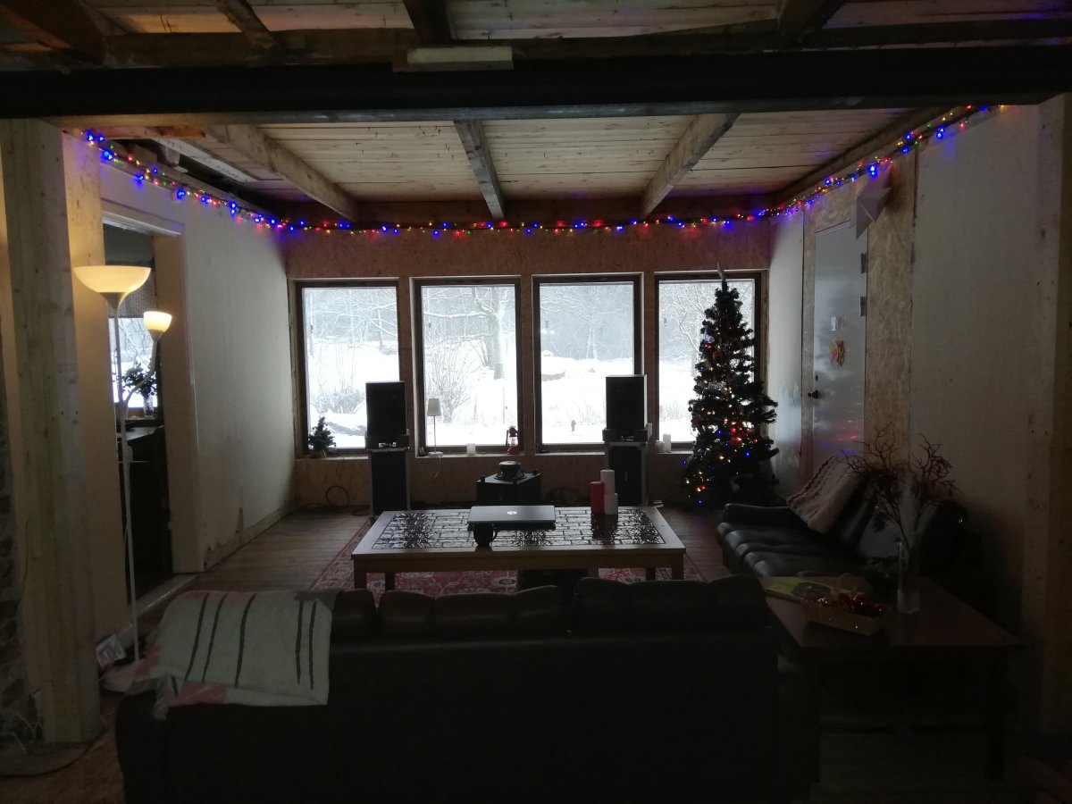 Under projektets gång så blev det ju plötsligt jul 🎅 ...så vi började pynta och då åkte såklart högtalarna oxå fram. Baslådan är mest för att testa vad som händer i ljudbilden med olika placering. Så som Baslådan är placerad på bilden skapas en 6 dB peak på 44 hz. Om man flyttar på baslådan 2,5 meter in i rummet (det blir dock väldigt opraktiskt att ha det möblerat så) så försvinner peaken och basåtergivningen blir betydligt jämnare från 27 hz. Men som ni ser är rummet helt obehandlat så när som mattan på golvet och dämp under högtalarna. Frekvensåtergivningen är väldigt orolig i detta rum just nu och ljudbilden spricker tydligt vid högre volym, men det är ju det vi ska ändra på 😀