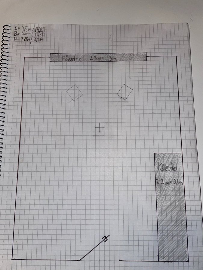 Bifogar ett par skisser på rummet jag kommer använda. Den första är som ni ser bara det tomma skalet och den andra har jag ritat in basfällor, absorbenter och moln(vilket det kan bli flera av närmare dörren). Det kommer fler noggrannare ritningar, jag är lite kass på sketch-up tyvärr, men ska försöka ge mig på det också.