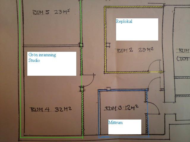 Jag lägger upp en bild på hur det kommer att se ut så går det kanske lättare att svara på hur det ser ut där jag kommer att hålla till. Kommer jag att störas av replokalen? Dom ska ljudisolera alla lokaler mycket eftersom det ligger i ett villa område. Min tanke var ju att man bygger en extravägg utanför den befintliga för att få mer ljuddämpning, dubbla dörrar in?