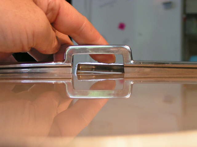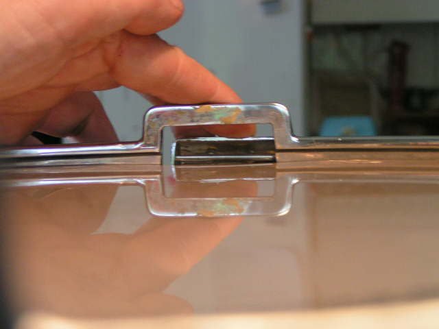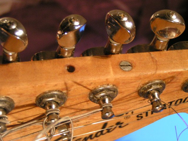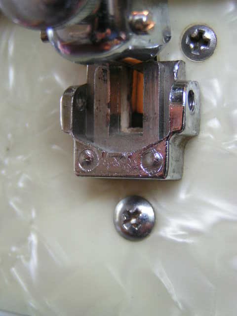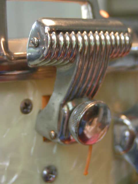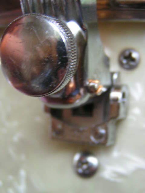 Så här ser mojängerna på utsidan ut. Första bilden är den ände där sejarn hamnar rätt. På "felsidan" är det som synes en till detalj i mekaniken, som jag inte fattar vad har för uppgift. Det fattas två små skruvar där också, ena skruvhålet syns, det andra sitter mitt emot. Tredje bilden, så här ser det ut med sejarn frånkopplad. Fjäde bilden, och här är den aktiverad, tillkopplad. Det som hindrar mekaniken att gå närmar skinnet är konstruktionen innen virveln. Jag tycker nästan det ser ut som att man redan vid tillverkning satt fast grejerna ett par mm fel på ena sidan. Skit. Annars har virveln ett underbart snärtigt och diskantrikt sound, även nu innan jag bytt slagskinnet, köpte nytt sånt med...