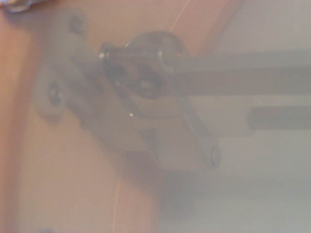 Jag skulle nog haft ett sorts platt band att fästa sejaren med, men det följde med snören till denna dyr-sejare, det skulle funka sas det i affärn. Och med band skulle sejaren likt förb hamna ett par mm under skinnet i ena änden. Suddiga bilden visar lite av mekaniken inne i rumman. Tredje bilden visar hur "knytpinnen" hamnar i den ände där sejarn ligger an lagom mot skinnet. Jag petar lite olyckligt på fästet så det står snett, det rättar till sig när man knyter dit sejarn. Här i denna änden hamnar alltså sejarn helt rätt vad jag förstår. Fjärde bilden visar andra änden, med sejaren nersänkt och urkopplad. (Här blir den upplyft eftersom rumman för fotograferingstekniska detaljer ligger uppochned på en mosvagga) Sista bilden visar den "dåliga änden", knytpinnen ligger aningen för långt från skinnet. 😠