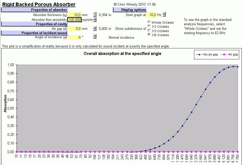 Du kan själv se hur olika tjocklekar absorberar med denna kalkylator: http://www.whealy.com/acoustics/Porous.html Även om man drar till med extremt flödesmotstånd så har tunna material ingen absorptionsförmåga i lägre register: "Carpet as Sound Absorber Carpet commonly dominates the acoustical picture in many types of spaces. It is the one amenity the owner often specifies in advance and the reason is more often comfort and appearance than acoustic. Carpet and its underlay can provide significant absorption at mid and high frequencies. Suppose that carpet is placed in a recording studio with a floor area of 1,000 ft2. Further, suppose that reverberation time is specified to be about 0.5 second, which requires 1,060 sabins of absorption in this room. At higher audio frequencies, a heavy carpet and pad with an absorption coefficient of around 0.6 gives 600 sabins of absorption at 4 kHz or 57% of the required absorption for the entire room before the absorption needs of walls and ceiling are even considered. The acoustical design is quite limited before it is started. There is another, more serious problem. This high absorbance of carpet is only at higher audio frequencies. Carpet having an absorption coefficient of 0.60 at 4 kHz may offer only 0.05 at 125 Hz. In other words, the 1,000 ft2 of carpet introduces 600 sabins at 4 kHz but only 50 sabins at 125 Hz. This is a major problem encountered in many acoustical treatments." "In some rooms, the acoustical treatment may prescribe an overuse of carpeted floors and drapes, which emphasizes a shortcoming of most porous absorbers—that of poor low-frequency absorption. Tiles of cellulose fiber with perforated faces are also deficient in low-frequency absorption. Overly enthusiastic use of porous absorbers causes overabsorption of high frequency sound energy, without addressing a major problem of room acoustics, low-frequency standing waves." Master Handbook of Acoustics