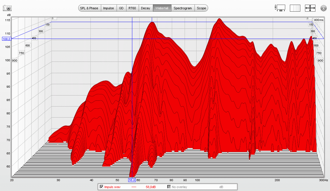 13. Det stora problemet är 57 Hz som har en reverbtid på över 0,9 sekunder. Vilka ytor som behöver behandlas (för detta) vågar jag inte gissa då längd och bredd är nästan lika långa.