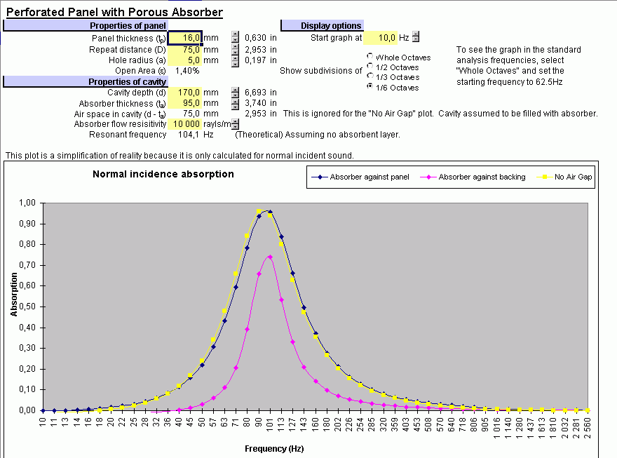 ”The perforations in the panel are assumed to be circular and greater than 1mm in diameter. For perforations less than 1mm in diameter, the impedance of the viscous air/panel boundary layer becomes significant, and the transfer matrix functions implemented here become inaccurate.”