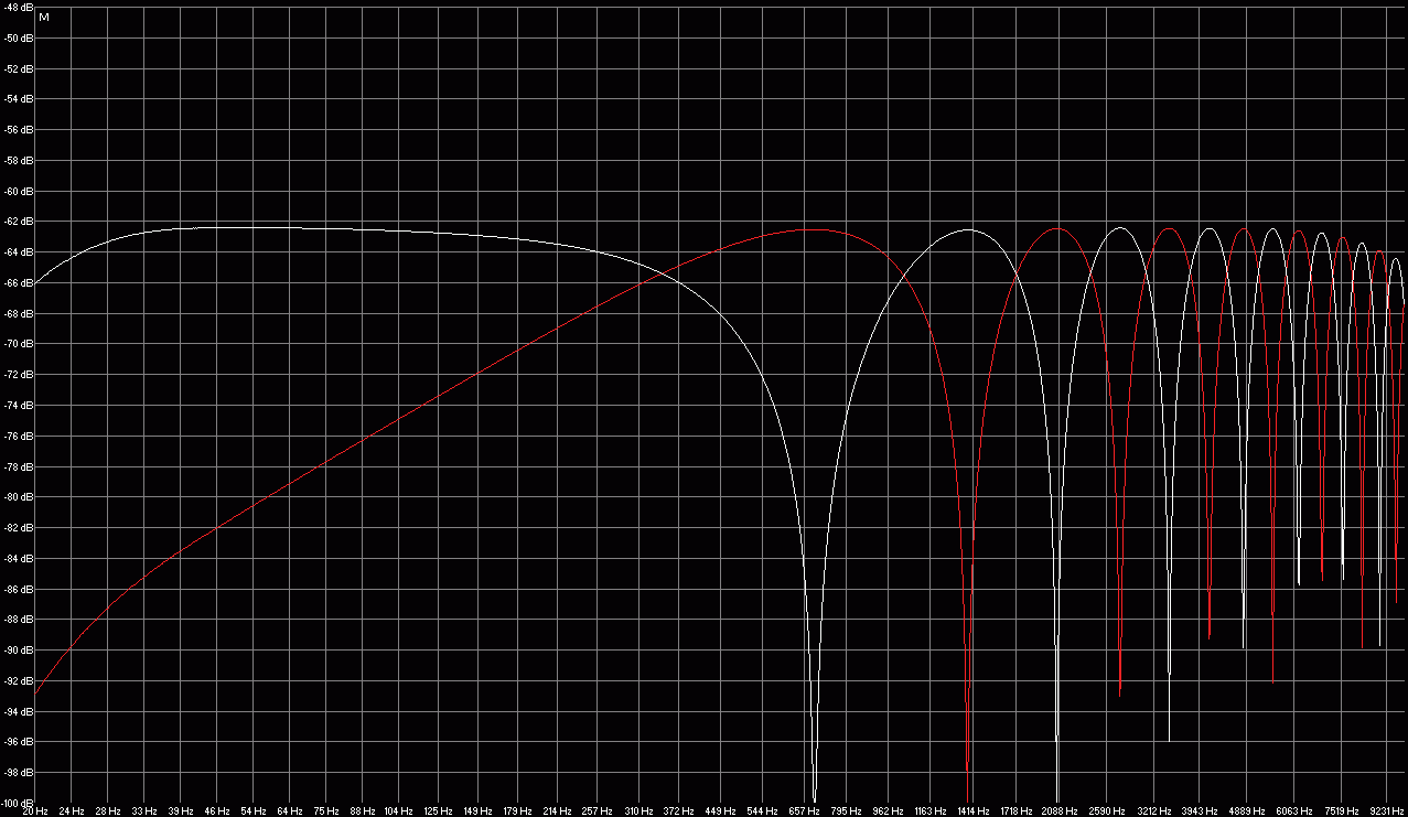 6. Vit linje = summan av bägge mickar men bakre mick fasvänd. Röd linje = summan av bägge mickar, bakre inte fasvänd.